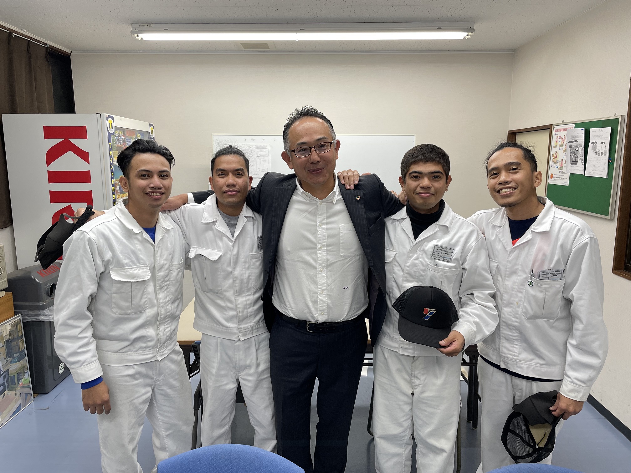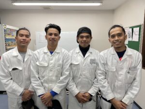 左から、マービンさん(31歳)、ウィンデルさん(24歳)、ロエルさん(22歳)、レナルドさん(27歳)、全員来日3年目の技能実習2号最後の年である。