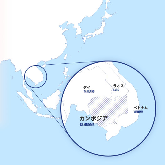カンボジア王国は東南アジアに位置します。国土面積は日本の約1/2で、西にタイ王国、東にベトナム社会主義共和国に挟まれユーラシア大陸で中国とは地続きで繋がっています。人口1,513万人、国民の90%以上がクメール語(カンボジア語)を話し、国民のほとんどが仏教徒です。